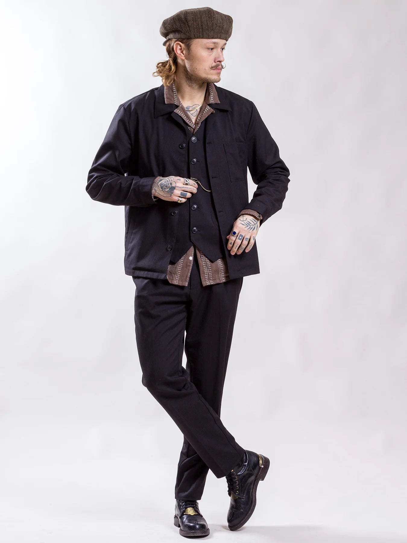 This edition is made in a black/ brown pinstripe wool mix with horn buttons.